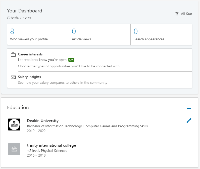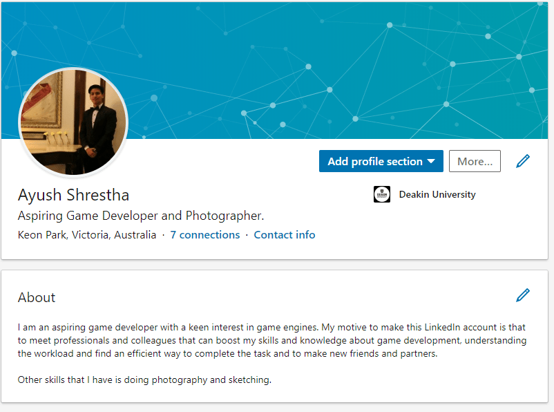 This page shows all of the connection I want to build within the community to develop myself, initiate my aspirations and meet new and cool people who are in my field. So to connect with those who are in my field I created my LinkedIn Profile. My profile will also provide my information and can be used to get found in LinkedIn. It contains information about my skills and experience. It can be used to match the skills required in the field and with the algorithm of LinkedIn i can be found by the employers’ Parameter. It gives me information about how I can get linked-up with the employers.